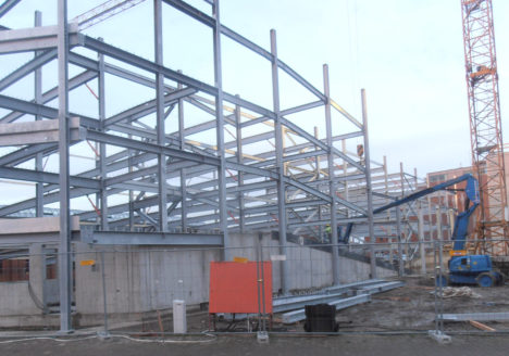 Der Aufbau der Stahlkonstruktion ist fast abgeschlossen. Es wird begonnen die ersten Montageunterstützungen für die Filigrandeckenelemente aufzubauen. Die Halbfertigteilplatten werden ab dem 28.11.2017 angeliefert. Auf dem Haupttreppenhaus wird die Gefälledämmung verlegt und…